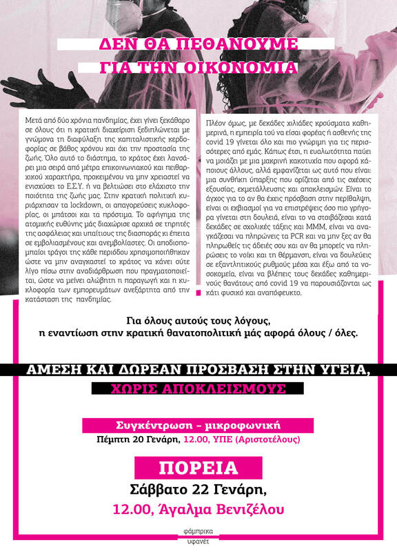 22 Ιανουαρίου διαδηλώνουμε για την υγεία και την αξιοπρέπεια του λαού