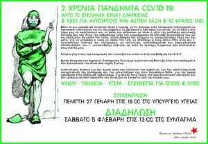 Δυο χρόνια κατά τη διάρκεια των οποίων, το (ήδη αποδεκατισμένο έπειτα από τη μνημονιακή δεκαετία) δημόσιο Σύστημα Υγείας υποβαθμίζεται και -ουσιαστικά- εξακολουθεί ακόμα να λειτουργεί, στηριζόμενο αποκλειστικά και μόνο στο ζήλο, την υπευθυνότητα και την αυταπάρνηση του εξαντλημένου και υποστελεχωμένου ιατρικού και νοσηλευτικού προσωπικού του, εκείνων των γιατρών, των νοσηλευτών - νοσηλευτριών και όλων των εργαζομένων στο ΕΣΥ, που επανειλημμένα βρέθηκαν και συνεχίζουν να βρίσκονται αντιμέτωποι και αντιμέτωπες με την κρατική καταστολή και τις διμοιρίες των (ως επί των πλείστων ανεμβολίαστων και αντιεμβολιαστών) ένστολων πραιτωριανών της Γ' ελληνικής "Δημοκρατίας".