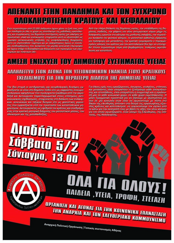 Κυβέρνηση και επιχειρηματίες επιβάλλουν στις «επιτροπές των ειδικών» τα υγειονομικά πρωτόκολλα της πλάκας οδηγώντας στο διαρκές μπάχαλο και τη διαστρέβλωση των επιστημονικών γνώσεων και κατακτήσεων. Το Ε.Σ.Υ. διαλύεται και ιδιωτικοποιείται περαιτέρω αντί να ενισχυθεί με υποδομές και προσλήψεις, οι υγειονομικοί που υπηρετούν το λαό μαχόμενοι την αρρώστια και το θάνατο αντιμετωπίζουν διαρκώς την εξουθένωση και τις απειλές των διορισμένων διοικήσεων, ενώ ο ιδιωτικός τομέας υγείας και οι μεγάλες φαρμακευτικές θησαυρίζουν αντί να έχουν επιταχθεί άνευ όρων προς όφελος της κοινωνίας. Τα media χειραγωγούν διασπείροντας τη σύγχυση και την «ατομική ευθύνη», τα Σώματα Ασφαλείας ενισχύονται για να περιφρουρούν το καθεστώς και να τρομοκρατούν με εκφοβισμούς και πρόστιμα, ενώ αντίθετα τα ΜΜΜ, τα σχολεία και οι σχολές λειτουργούν με ακόμα χειρότερους όρους από πριν.