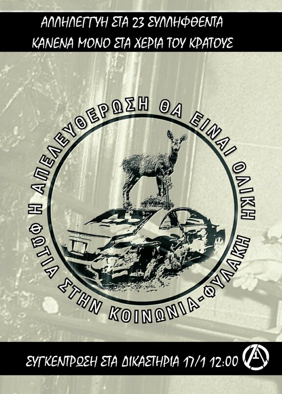 Συγκέντρωση αλληλεγγύης για τα συλληφθέντα Δευτέρα 17/1 στις 12:00 στα δικαστήρια Θεσσαλονίκης.