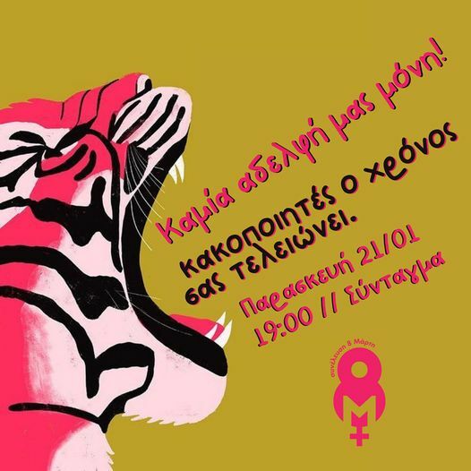 ΚΑΜΙΑ ΑΔΕΡΦΗ ΜΑΣ ΜΟΝΗ | ΠΑΡΑΣΚΕΥΗ 21/01, ΣΤΙΣ 19:00, ΣΤΟ ΣΥΝΤΑΓΜΑ