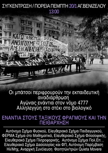Συγκέντρωση - Πορεία ενάντια στο νόμο 4777 και το νέο εκπαιδευτικό νομοσχέδιο Άγαλμα Βενιζέλου, Πέμπτη 20/1 13:00