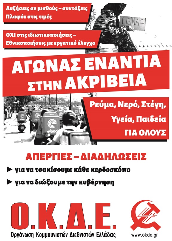 Ρεύμα, Νερό, Υγεία, Παιδεία, Στέγη είναι ΚΟΙΝΩΝΙΚΑ ΑΓΑΘΑ, όχι εμπορεύματα. ΣΤΟΠ στους πλειστηριασμούς λαϊκών σπιτιών. Εργατικός - Κοινωνικός έλεγχος στις τιμές, για να τσακίσουμε τους κερδοσκόπους.