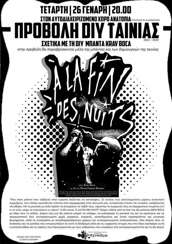 προβολή της diy ταινίας «A la fin des nuits» σχετικά με τη diy μπάντα KRAV BOCA