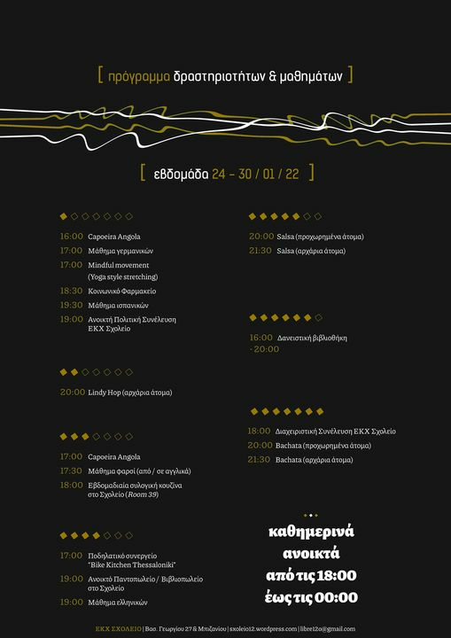 Week 24 to 30 January at the Free Social Space School You will find us and we will find you daily from 18:00 to about midnight. New lesson and activity: - German lesson today, 24/01, at 17:00 - Mindful movement (yoga style stretching) σήμερα, 24/01, στις 17:00