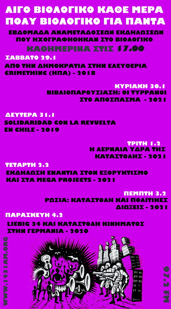 Εβδομάδα αναμεταδοσεων εκδηλώσεων που είχαν ηχογραφηθεί στο στεκι στο Βιολογικό τα τελευταία χρόνια, κάθε μέρα στις 17.00.
