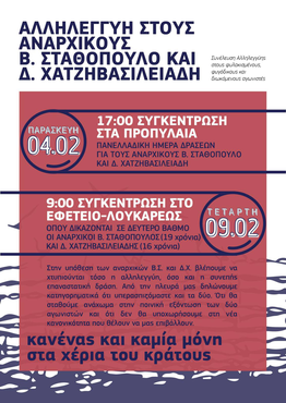 Στηρίζουμε το κάλεσμα για μικροφωνική συγκέντρωση στα Προπύλαια, την Παρασκευή 4 Φεβρουαρίου στις 17:00, στα πλαίσια της πανελλαδικής μέρας δράσης για τους αναρχικούς Β.Σ. και Δ.Χ., καθώς και στο εφετείο στην οδό Λουκάρεως, την Τετάρτη 9 Φεβρουαρίου στις 9:00, όπου δικάζονται σε δεύτερο βαθμό.