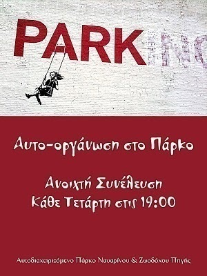Η επόμενη ανοιχτή συνέλευση του Αυτοδιαχειριζόμενου Πάρκου Ναυαρίνου & Ζωοδόχου Πηγής θα γίνει την Τετάρτη,5 Οκτωβρίου,στις 7 το απόγευμα.