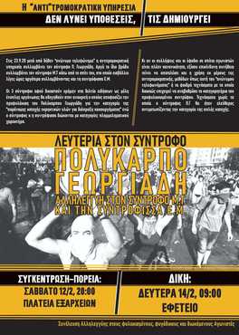Κάλεσμα σε συγκέντρωση Αλληλεγγύης για τους συντρόφους Πολύκαρπο Γεωργιάδη, Μ.Τ. και την συντρόφισσα Ε.Μ.