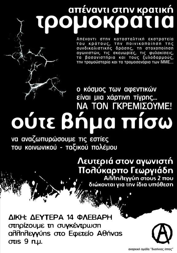 Το δικαστήριο του Πολύκαρπου Γεωργιάδη καθώς και του συντρόφου Μ.Τ. και της Ε.Μ ορίστηκε στις 14 Φεβρουαρίου στις 9πμ στο Εφετείο Αθηνών (Λουκάρεως).