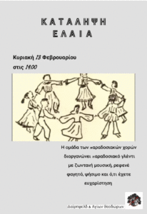 Κυριακή 13/02/2022 η ομάδα παραδοσιακών χορών της Ελαίας,οργανώνει το πρώτο της γλέντι για το νέο έτος.