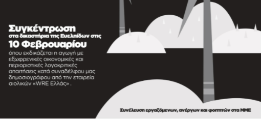 Αύριο, Πέμπτη, στις 9 στην ΑΙΘΟΥΣΑ ΠΡΟΚΑΤ δικάζεται η αγωγή για συκοφαντική δυσφήμιση που έχει ασκήσει η εταιρία WRE(ανεμογεννήτριες) στο δημοσιογράφο Τάσο Σαραντή για άρθρο με τίτλο "Οι ανεμογεννήτριες γεννούν βιομηχανία διώξεων".