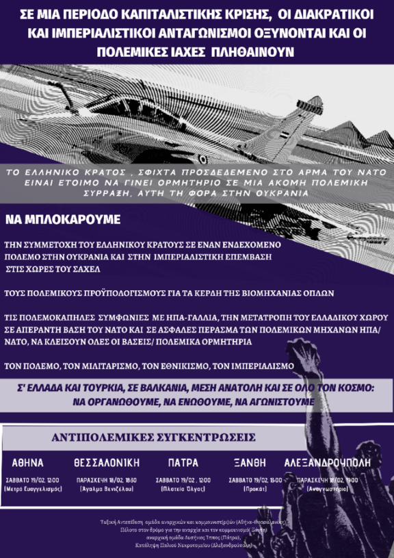 Μέσα από την ανάλυση της πραγματικότητας οφείλουν να προκύπτουν οι απτές προεκτάσεις της πάλης ενάντια στον ιμπεριαλισμό και τον πόλεμο, όπως αυτές γειώνονται εδώ και τώρα και όχι να αναζητείται ο εχθρός κάπου μακριά και έξω από το φυσικό πεδίο της ζωής και της δράσης μας. Σήμερα, είναι πιο αναγκαίο από ποτένα αντιληφθούμε ότι οι λαοί, οι φτωχοί και οι καταπιεσμένοι αυτού του κόσμου, δεν έχουμε τίποτα να χωρίσουμε και πως ο βασικός μας εχθρός, στη δική μας γωνιά του πλανήτη, είναι μέσα στην Ελλάδα, μέσα στην Ε.Ε., μέσα στο ΝΑΤΟ.Οφείλουμε να οικοδομήσουμε ένα μαχητικό κίνημα που θα ακυρώσει τις πολεμικές συμφωνίες με ΗΠΑ και Γαλλία, θα βάλει φρένο στην συμμετοχή της Ελλάδας στην ιμπεριαλιστική επέμβαση στο Σαχέλ, θα εναντιωθεί στην παρουσία δυνάμεων των ΗΠΑ και του ΝΑΤΟ σε Αλεξανδρούπολη, Σούδα και σε μία σειρά άλλες περιοχές τις οποίες έχουν μετατρέψει σε περάσματα και ορμητήρια θανάτου. Ένα κίνημα που θα στοχοποιεί τα μεγάλα ενεργειακά έργα που συγκεντρώνουν το γεωπολιτικό ενδιαφέρον και αυξάνουν τις πιθανότητες επέμβασης από ανταγωνιστικές δυνάμεις, την κούρσα στρατιωτικών εξοπλισμών που ροκανίζει πόρους που θα μπορούσαν να καλύψουν τις κοινωνικές ανάγκες, τον μιλιταρισμό, την υποχρεωτική στράτευση, την εμπλοκή του στρατού σε κοινωνικά ζητήματα, την ίδια την πολεμική προετοιμασία του ελληνικού κράτους. Είναι ώρα να γίνει κτήμα στο σύνολο της κοινωνικής βάσης ότι με τη συμμετοχή σε κάποιο πόλεμο δεν έχουμε να κερδίσουμε τίποτα, ότι έχουμε κάθε λόγο να μπλοκάρουμε και να αρνούμαστε να συμμετάσχουμε στα σχέδια για τα νέα σφαγεία που μας ετοιμάζουν, αλλά και το ότι ακόμα και σε μία τέτοια περίπτωση πρέπει να παλέψουμε για να μετατρέψουμε τους επερχόμενους ιμπεριαλιστικούς και διακρατικούς πολέμους σε ταξικούς και επαναστατικούς.