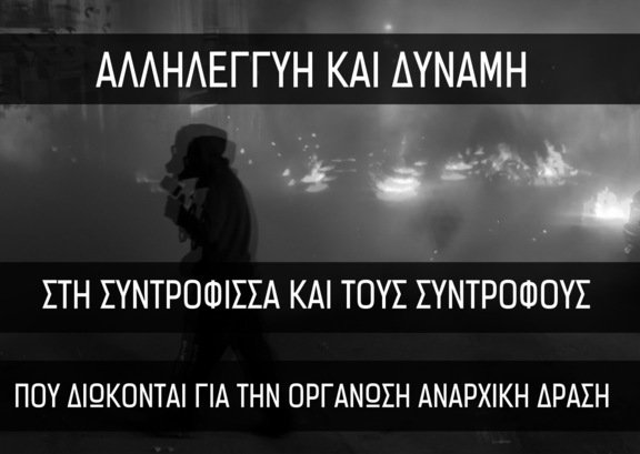 Ως αναρχικές/οι έχουμε το χρέος απέναντι στους ίδιους μας τους αγώνες, απέναντι στην ίδια την πολιτική μας ύπαρξη να μην εγκαταλείπουμε ο ένας την άλλη ακόμη και όταν οι καιροί δυσκολεύουν. Οι ιδέες μας και οι δεσμοί μας θα είναι για πάντα ένα όπλο που δεν θα μπορέσουν ποτέ να κατανοήσουν. Δεν αφήνουμε καμιά/κανέναν μόνη/ο στα χέρια της εξουσίας. Γιατί μόνο όταν θα περπατήσουμε όλοι και όλες μαζί πάνω στα συντρίμμια του γερασμένου αυτού κόσμου, πορευόμενοι/ες προς μια επαναστημένη κοινωνία με τις δικές μας αξίες και ιδανικά, θα είμαστε ελεύθεροι/ες.