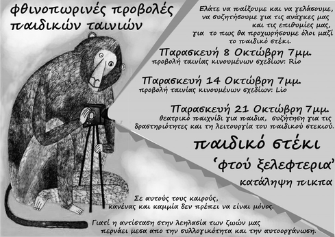 Παρασκευή 7 Οκτώβρη 7 μ.μ. προβολή ταινίας κινουμένων σχεδίων: RIO Παρασκευή 14 Οκτώβρη 7 μ.μ. προβολή ταινίας κινουμένων σχεδίων: LIO Παρασκευή 21 Οκτώβρη 7 μ.μ. θεατρικό παιχνίδι για παιδιά, συζήτηση για τις δραστηριότητες και τη λειτουργία του παιδικού στεκιού Και η αφίσα:
