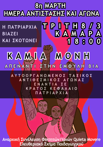 Παρόλες τις προσπάθειες της κυριαρχίας να αποχαρακτηρίσει την συγκεκριμένη μέρα, αποκόπτοντας την από τις ρίζες της και υποβαθμίζοντάς την σε «γιορτή της γυναίκας», η 8η Μάρτη ως μέρα αντίστασης και αγώνα είναι πιο επίκαιρη και αναγκαία από ποτέ. Οι αγώνες ενάντια στην πατριαρχία που δόθηκαν και δίνονται καθημερινά κρατούν ακόμα ανοιχτό τον δρόμο για την γυναικεία χειραφέτηση και τη συντριβή του κόσμου της εξουσίας, δημιουργώντας αναχώματα στην ολοένα και εντονότερη επέλαση του σύγχρονου ολοκληρωτισμού, φωνάζοντας ότι οι γυναικοκτονίες, οι βιασμοί και οι παρενοχλήσεις δεν θα γίνουν κανονικότητα, ότι δεν θα συνηθίσουμε τον θάνατο και τον εξευτελισμό.