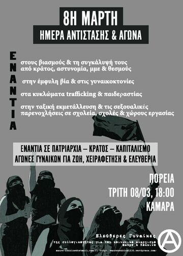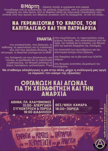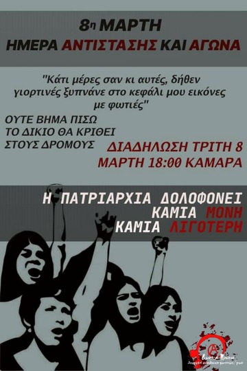 Πίσω από τους βολικούς για την κυριαρχία µύθους, που διαστρεβλώνουν την υπόθεση της γυναικείας χειραφέτησης παρουσιάζοντάς την ως αίτηµα "ισότητας" στη διαχείριση της εξουσίας, κρύβεται η ιστορία αιματηρών, μαχητικών αγώνων και εξεγέρσεων γυναικών από τα κάτω. Οι ρίζες της 8ης Μάρτη, ως ημέρας μνήμης των γυναικείων αγώνων και αντιστάσεων, βρίσκονται στις κινητοποιήσεις και τις απεργίες μεταναστριών εργατριών που ξέσπασαν στον κλάδο της κλωστοϋφαντουργίας στις ΗΠΑ στις αρχές του 20ού αιώνα. Αγώνες ριζοσπαστικοί και μαχητικοί, που ξεσπούσαν μέσα από τους κόλπους του πιο άγρια εκµεταλλευόµενου κοµµατιού της κοινωνίας. Αγώνες που δείχνουν τον δρόμο στο σήμερα, σε μια περίοδο όπου η όξυνση της πατριαρχικής βίας προς τις γυναίκες, ιδιαίτερα των πληβειακών στρωμάτων, πάνω στα σώματα τους και σε κάθε πτυχή της κοινωνικής τους ζωής, αποτελεί αναπόσπαστο κομμάτι της κρατικής και καπιταλιστικής βαρβαρότητας: των θανάτων λόγω της κρατικής διαχείρισης της πανδημίας και της απαξίωσης της ανθρώπινης ζωής, της θεσμικής αδιαφορίας για την κάλυψη των κοινωνικών αναγκών και της συνεχούς επίθεσης απέναντι στους φτωχούς, τους αποκλεισμένους, τους αδύναμους.