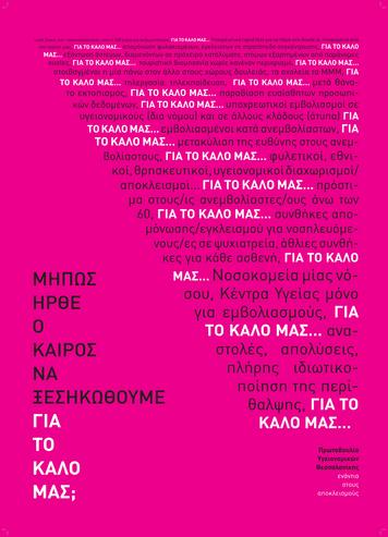 Με όχημα το καλό αυτού που αποκαλούν δημόσια υγεία (και παρά το φιάσκο του τείχους ανοσίας) κατέστρεψαν εδώ και 2 χρόνια την όποια δημόσια περίθαλψη και τα εργασιακά δικαιώματα. Με την κατάργηση της πρωτοβάθμιας φροντίδας, το κλείσιμο των εξωτερικών ιατρείων των νοσοκομείων, τη μετατροπή των νοσοκομείων σε μονοθεματικά, την αποψίλωση όλων των λειτουργιών για να λειτουργήσουν τα εμβολιαστικά κέντρα και τέλος το κλείσιμο νοσοκομείων για να γίνουν εμβολιαστικά κέντρα, όπως είδαμε όψιμα να συμβαίνει με το Παίδων Πεντέλης. Ενώ ταυτόχρονα σιωπή για τα φακελάκια, τα απογευματινά ιατρεία, τις λίστες αναμονής των χειρουργείων που στόμωσαν ακόμα περισσότερο. Σιωπή για το στίβαγμα στα τμήματα επειγόντων περιστατικών, στα μέσα μαζικής μεταφοράς, στα σχολεία και στα εργοστάσια. Η κοινωνική αποστασιοποίηση κι αυτή για το καλό μας, εφαρμόστηκε μόνο στις διαμαρτυρίες και επιτεύχθηκε για τους κοινωνικούς αγώνες. Για το καλό μας όλα αυτά. Για το καλό μας και οι απολύσεις υγειονομικών.