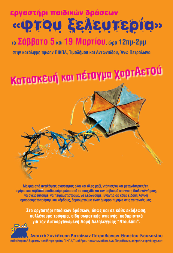 Εργαστήρι παιδικών δράσεων «Φτου Ξελευτερία» το Σάββατο 5 και 19 Μαρτίου, ώρα 12πμ-2μμ, στην κατάληψη πρώην ΠΙΚΠΑ, Τιμοδήμου και Αντωνιάδου, Άνω Πετράλωνα