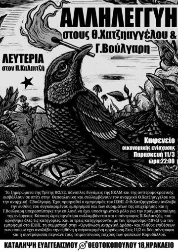 Τα ξημερώματα της Τρίτης 8/2/2022, πάνοπλες δυνάμεις της ΕΚΑΜ και της αντιτρομοκρατικής εισβάλλουν σε σπίτι στην Άνω Πόλη Θεσσαλονίκης και συλλαμβάνουν τον αναρχικό σύντροφο Θάνο Χατζηαγγέλου και την αναρχική συντρόφισσα Γεωργία Βούλγαρη. Έχει προηγηθεί ο εμπρησμός του ΙΕΘΠ (Ίδρυμα Εθνικού και Θρησκευτικού Προβληματισμού). Ο σύντροφος Θάνος Χατζηαγγέλου ανέλαβε την ευθύνη του συγκεκριμένου εμπρησμού και των ευρημάτων της επιχείρησης και η συντρόφισσα Γεωργία Βούλγαρη υπερασπίστηκε την επιλογή να έχει υποστηρικτικό ρόλο για την πραγματοποίηση της ενέργειας. Κάποιες ώρες αργότερα συλλαμβάνεται και ο σύντροφος Πάνος Καλαιτζής, που αρνήθηκε όλες τις κατηγορίες.Και οι τρεις κατηγορούνται με τον τρομονόμο (187α) για τον εμπρησμό στο «Ίδρυμα Εθνικού και Θρησκευτικού Προβληματισμού», τη συμμετοχή στην «Οργάνωση Αναρχική Δράση» και πλήθος επιθέσεων των οποίων έχει αναλάβει την ευθύνη η συγκεκριμένη οργάνωση.Στις 11/2 οι δύο σύντροφοι και η συντρόφισσα περνάνε τους τσιμεντένιους τοίχους των φυλακών Κορυδαλλού.