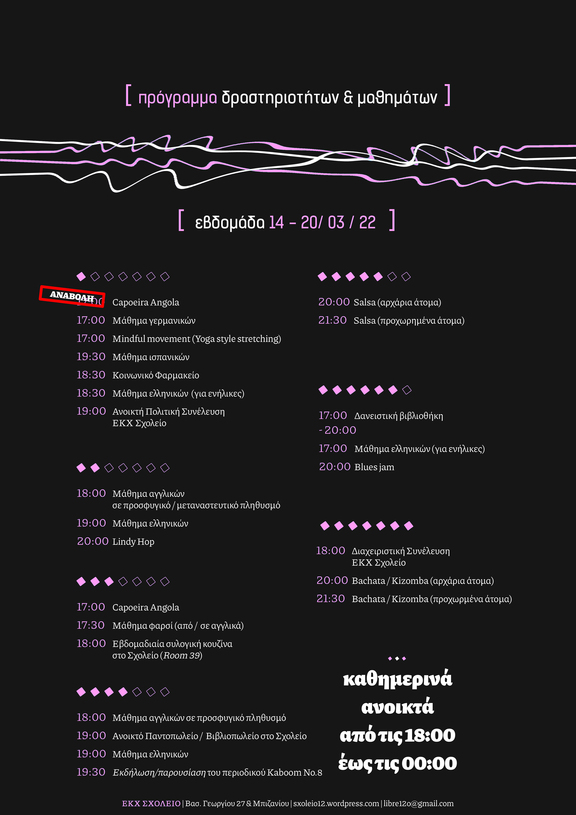 Το μάθημα της Capoeira Angola για αυτή τη Δευτέρα (14/03) αναβάλλεται.