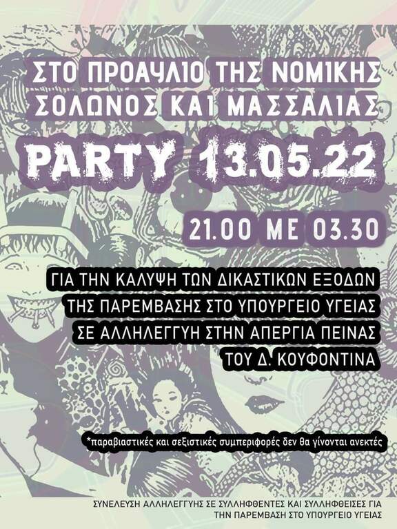 Την Παρασκευή 13/05, 21:00, στην Νομική Αθήνας διοργανώνουμε μπαρ για τα δικαστικά έξοδα των συλληφθέντων από την παρέμβαση στο Υπ. Υγείας, που πραγματοποιήθηκε στα πλαίσια των κινήσεων αλληλεγγύης στον τότε απεργό πείνας Δ. Κουφοντίνα.