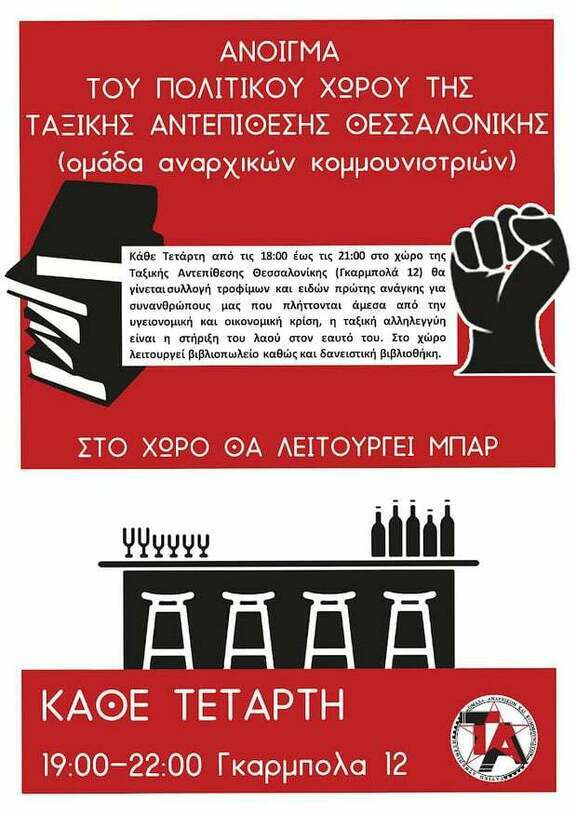 Κάθε Τετάρτη, από τις 19.00 ως τις 22.00 θα πραγματοποιείται άνοιγμα του πολιτικού χώρου της Ταξικής Αντεπίθεσης Θεσσαλονίκης που βρίσκεται στην οδό Γκαρμπολά 12.