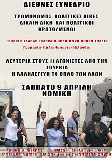 ΚΑΙΟΣΥΝΗ ΓΙΑ ΤΟΥΣ 11 ΕΠΑΝΑΣΤΑΤΕΣ» σε πολλές ευρωπαϊκές χώρες, στη Γερμανία, Ιρλανδία, Αγγλία,Γαλλία, Ελβετία, Αυστρία, Βέλγιο, Ολλανδία, Ιταλία. Ως συνέχεια αυτής της κινητοποίησης, το Σάββατο 9 Απριλίου 2022, διοργανώνουμε στην Αθήνα, στη Νομική, ένα διεθνές συνέδριο με τίτλο «Τρομονόμος, πολιτικές δίκες, δίκαιη δίκη και πολιτικοί κρατούμενοι». Θα υπάρχουν συμμετοχές από Τουρκία,Ελλάδα, Ιρλανδία, Παλαιστίνη, Ιταλία, Ισπανία, Γαλλία, Περού, Ολλανδία κτλ.