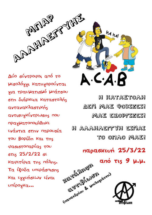 Χρονικό της καταστολής: Στις 25/2/22 πραγματοποιήθηκε στο Μεσολόγγι αντανακλαστική συγκέντρωση ενάντια στην παρουσία του Μάκη Βορίδη στο πλαίσιο προγραμματισμένης εκδήλωσης της ΝΔ σε καφετέρια της πόλης. Λίγη ώρα αργότερα μια ομάδα ΟΠΚΕ έσπευσε να περιφρουρήσει την καφετέρια, ενώ αστυνομικοί διοικητές με απειλές και τραβήγματα λυσσομανούσαν να διώξουν τα άτομα που είχαν μαζευτεί. Όσο κυλούσε ο χρόνος όλο και περισσότερος κόσμος, περαστικοί, μαθητές και μαθήτριες συσπειρώνονταν απέναντι στον αποκλεισμό των μπάτσων. Για περίπου μιάμιση ώρα ακούγονταν συνθήματα, γιουχαΐσματα και εκτοξεύονταν νεράντζια, πορτοκάλια προς τους θαμώνες της εκδήλωσης, που περιλάμβαναν όλα τα κεφάλια της ΝΔ Αιτ/νίας όπως ο βουλευτής Κώστας Καραγκούνης και ο πρώην υπουργός Σπήλιος Λιβανός. Τη στιγμή που ολοκληρωνόταν η θεσμική φασιστομάζωξη το σώμα της συγκέντρωσης δέχτηκε απρόκλητη επίθεση από άλλη ομάδα της ΟΠΚΕ, από πλαϊνό δρόμο. Στη σύγκρουση που ακολούθησε σώμα με σώμα άνοιξε το κεφάλι ενός μπάτσου, ενώ ο περισσότερος συγκεντρωμένος κόσμος διασκορπίστηκε στα στενά της πόλης.