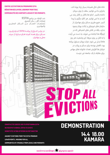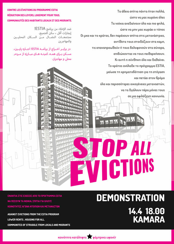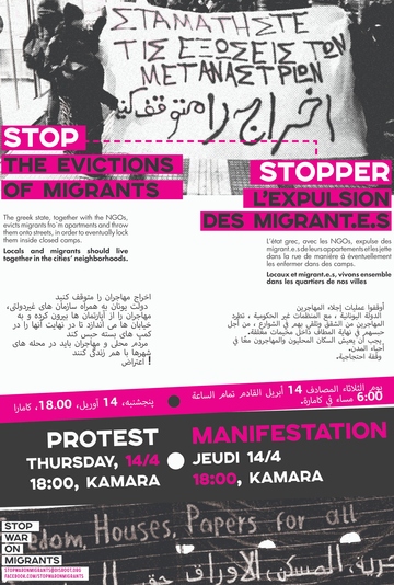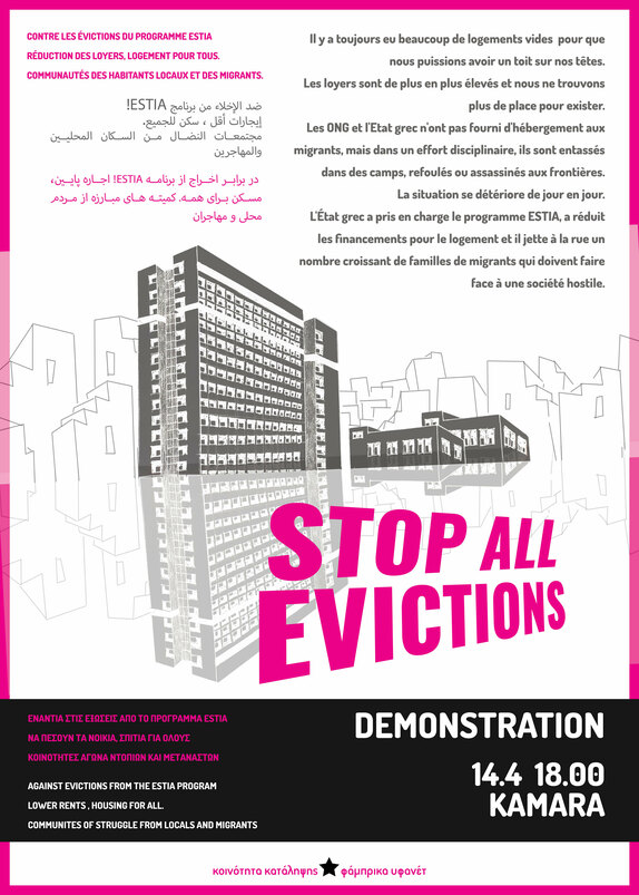 As it has been announced from the Ministry of migration and asylum, which has under its authority (following the UN High Commissioner for Refugees) the "ESTIA II" program, the houses of the program will be reduced to 10.000 from 27.000 starting from the 16th of April. This will lead gradually to the termination of the program at the end of 2022. Thus, evictions of migrants are constantly taking place. The various NGOs that participate in the program use institutional and non-institutional methods of blackmail and intimidation, and migrants are pushed to leave their homes in the first month after the results of their asylum application (regardless the result itself). Even then, in the face of being homeless, many migrants refused to leave their houses and imposed their needs, fighting against the threats of the NGOs.