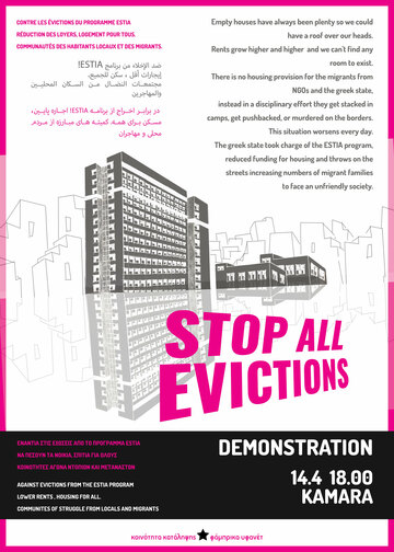Comme l'a annoncé le Ministère de la migration et de l'asile, qui a sous son autorité (à la demande du Haut Commissariat des Nations Unies pour les Réfugiés) le programme "ESTIA II", les maisons du programme seront réduites de 27.000 à 10.000 à partir du 16 avril, conduisant progressivement à la fin du programme à la fin de 2022. Ainsi, des expulsions de migrant.es ont lieu en permanence. Les différentes ONG qui participent au programme utilisent des méthodes institutionnelles et non-institutionnelles de chantage et d'intimidation, et les migrant.es sont poussés à quitter leur domicile dans le premier mois suivant les résultats de leur demande d'asile (indépendamment du résultat lui-même).