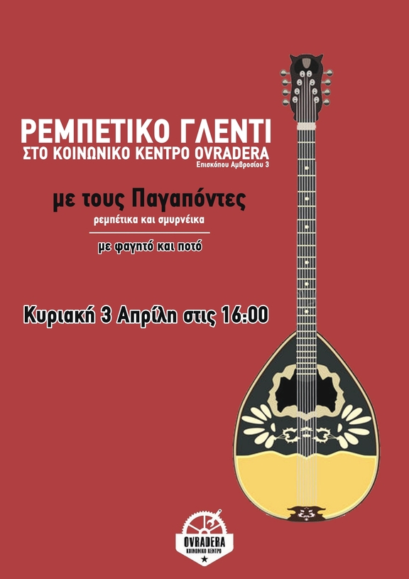 Ρεμπέτικο γλέντι οικονομικής ενίσχυσης του Κοινωνικού Κέντρου Ovradera με το μουσικό σχήμα "Παγαπόντες" (ρεμπέτικα και σμυρνέικα), φαγητό και ποτό.