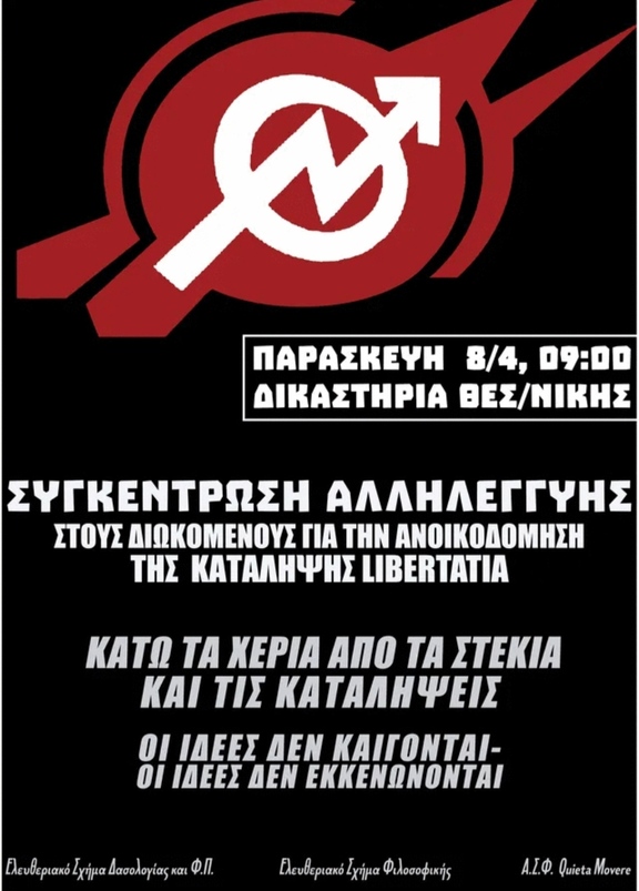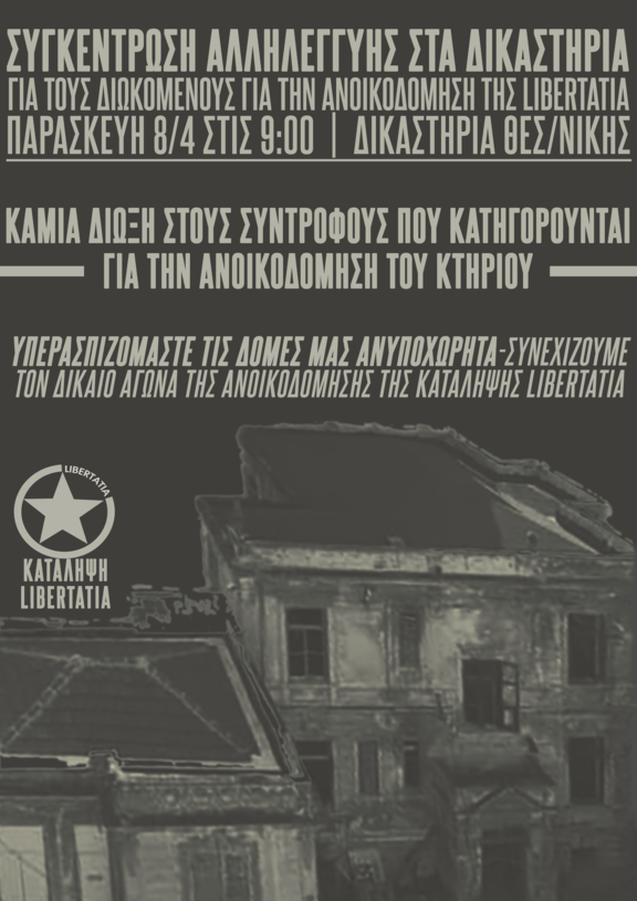 Την Παρασκευή 08.04 στις 09:00 εκδικάζεται η υπόθεσης της ανοικοδόμησης της κατάληψης Libertatia. Τον Γενάρη του 2018 η Libertatia δέχεται επίθεση από ομάδα φασιστών, κατά τη διάρκεια συλλαλητηρίου για τη μακεδονία, με αποτέλεσμα τον εμπρησμό του κτηρίου. Στις 08.11.2019 κατά τη διάρκεια εργασιών επισκευής της κατάληψης, η αστυνομία εισβάλει στο χώρο και συλλαμβάνει 4 άτομα με τις κατηγορίες της «καταστροφής μνημείου πολιτιστικής κληρονομιάς». Εν μέσω διαρκούς κρίσης και επίθεσης του κράτους στις αυτοοργανωμένες δομές αγώνα και τον αυτόνομο τρόπο δράσης, η υπεράσπιση των καταλήψεων είναι για εμάς ζωτικής σημασίας. Για να συνεχίσουμε να υπάρχουμε σε αυτήν την πόλη, να συναντίομαστε μακριά από την εμπορευματική σχέση και να δημιουργούμε ρωγμές στην εξατομικευμένη καθημερινότητα.
