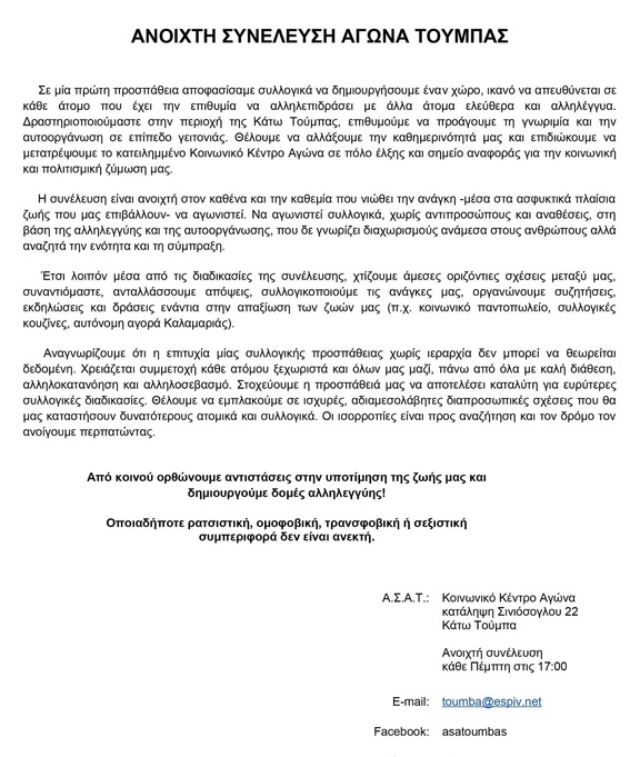 τι; : συνέλευση από : Ανοιχτή Συνέλευση Αγώνα Τούμπας