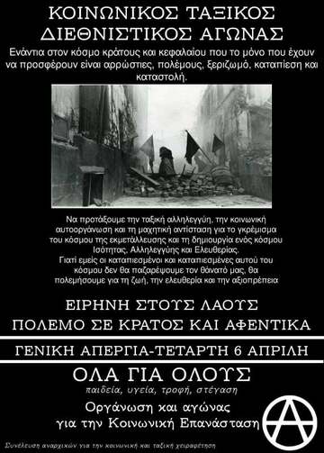 Ενάντια στο κρατικό και καπιταλιστικό σύστημα που δεν έχει να προσφέρει τίποτα περισσότερο από φτώχεια, εξαθλίωση και θάνατο να οξύνουμε τις κοινωνικές και ταξικές αντιστάσεις για το γκρέμισμα του χρεοκοπημένου κόσμου της εξουσίας. Να αγωνιστούμε συλλογικά και από τα κάτω ενάντια στους δυνάστες μας, να δυναμώσουμε και να περιφρουρήσουμε τις κοινωνικές και ταξικές αντιστάσεις που βρίσκονται στο στόχαστρο της καταστολής και να οργανώσουμε νέες. Χωρίς να έχουμε αυταπάτες για τον ρόλο των θεσμών, χωρίς να προσφέρουμε καμία συναίνεση στη διαχείριση της ζωής μας, να μην κάνουμε ούτε βήμα πίσω σε αυτά που έχουμε κατακτήσει και που διαρκώς διακυβεύονται και να κάνουμε τους χώρους που εργαζόμαστε, φοιτούμε και ζούμε εστίες αντίστασης και αγώνα. Απέναντι στον πόλεμο, που αποτελεί μονόδρομο σωτηρίας για το κρατικό και καπιταλιστικό σύστημα, απέναντι στο σχέδιο αλληλοεξόντωσης των εκμεταλλευόμενων και καταπιεσμένων, απέναντι στον εθνικισμό, τον φασισμό και τον ιμπεριαλισμό η μόνη ελπίδα είναι η διεθνιστική αλληλεγγύη μεταξύ των λαών, η οργανωμένη αντεπίθεση των από τα κάτω. Ο μόνος δικός μας πόλεμος είναι ο κοινωνικός και ταξικός! Για την ανατροπή του κόσμου της εξουσίας και τη δημιουργία μιας κοινωνίας ισότητας, ελευθερίας και δικαιοσύνης!