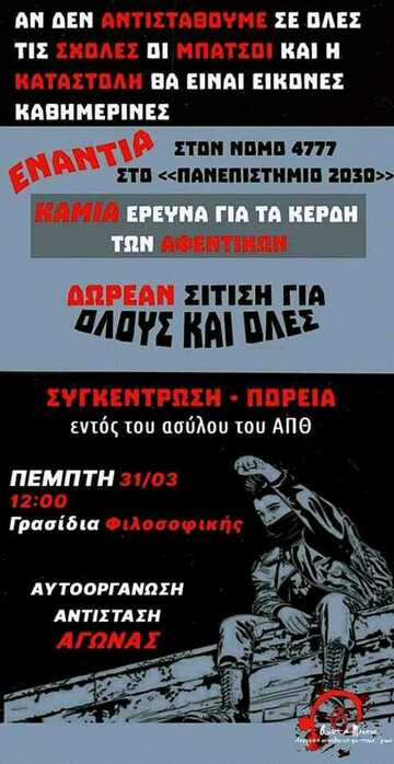 Τον Φεβρουάριο του 2021 ψηφίζεται ο νόμος 4777, ένας νόμος που συνδεόμενος με μία χρόνια προσπάθεια εκπαιδευτικής αναδιάρθρωσης έρχεται να ενσαρκώσει το όραμα του νεοφιλελευθερισμού για το σύγχρονο ελληνικό πανεπιστήμιο, ακολουθώντας πιστά τα δυτικά ευρωπαϊκά πρότυπα. Οι βασικότερες πτυχές του είναι η θέσπιση της ελάχιστης βάσης εισαγωγής στην τριτοβάθμια εκπαίδευση, οι διαγραφές ν+ν/2 φοιτητών και φοιτητριών, τα πειθαρχικά συμβούλια και η ίδρυση πανεπιστημιακής αστυνομίας. Η πρώτη πτυχή (ελάχιστη βάση εισαγωγής), αποκλείει με ταξικά κριτήρια χιλιάδες μαθητές και μαθήτριες από την εισαγωγή τους στα πανεπιστήμια, οι οποίοι/ες ανήκουν κατά βάση στα κατώτερα κοινωνικά στρώματα και αδυνατούν να ανταπεξέλθουν οικονομικά στα υπέρογκα έξοδα που απαιτούνται για την "επιτυχία" στις πανελλαδικές εξετάσεις. Ήδη από τον πρώτο χρόνο εφαρμογή της, πάνω από 40.000 άτομα έμειναν εκτός σχολών, ενώ σε αρκετά πανεπιστημιακά τμήματα παρατηρήθηκε μηδενική ή ολιγάριθμη κάλυψη των προσφερόμενων θέσεων. Οι διαγραφές των φοιτητ(ρι)ών αποτελούν εξίσου πλήγμα της τάξης μας, καθώς οριοθετώντας χρονικά την φοίτηση, αγνοείται το κομμάτι της φοιτητικής κοινότητας που αναγκάζεται να εργάζεται για να βιοποριστεί και κατ' επέκταση δεν ολοκληρώνει τις σπουδές στο προβλεπόμενο όριο. Παράλληλα, το πανεπιστήμιο ως επέκταση του ιδεολογικού μηχανισμού του κράτους και του κεφαλαίου, έρχεται να επιβάλλει την λογική της πειθάρχησης και της υποταγής, προετοιμάζοντας τα φοιτητικά υποκείμενα για τη ένταξή τους στην αγορά εργασίας. Η θέσπιση των διαγραφών, ευθυγραμμίζεται με αυτή τη λογική και εντατικοποιεί ακόμα περισσότερο τις σπουδές μας. Ο κατασταλτικός χαρακτήρας του νόμου αποκρυσταλλώνεται ακόμη πιο αισθητά με την ύπαρξη των πειθαρχικών συμβουλίων, τα οποία ποινικοποιούν οποιαδήποτε πολιτική και μη δράση εντός του πανεπιστημίου, και κορυφώνεται με την ίδρυση της πανεπιστημιακής αστυνομίας, συνδυαστικά με τις απειλές για face control, κάρτες εισόδου και τοποθέτηση τουρνικέ για ελεγχόμενη είσοδο στα ΑΕΙ επισφραγίζοντας την συνθήκη φόβου και τρομοκρατίας.