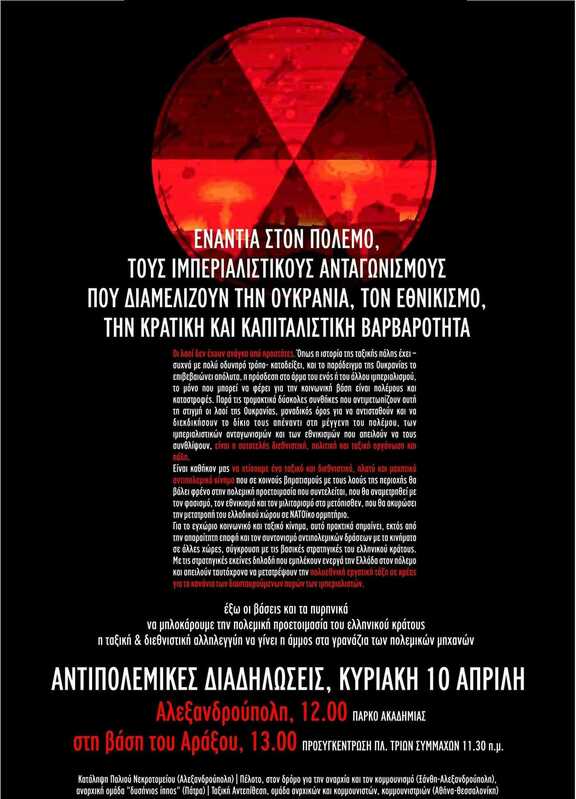 Την Τρίτη 5/4 στις 20.00 στον πολιτικό χώρο της Ταξικής Αντεπίθεσης Θεσσαλονίκης (Γκαρμπολά 12) θα συζητηθεί η οργανωμένη μετάβαση στην Αλεξανδρούπολη όπου θα πραγματοποιηθεί διαδήλωση καλεσμένη από τον αντιπολεμικό συντονισμό Έβρου την Κυριακή 10/4.