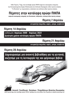 Πέμπτη 14 Απριλίου Εκδήλωση: Απρίλιος 2009 - Απρίλιος 2022 Δεκατρία χρόνια κατάληψη πρώην ΠΙΚΠΑ.