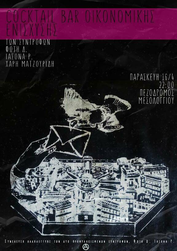 Cocktail μπαρ οικονομικής ενίσχυσης το Σάββατο 16/4 στις 22:00 στην οδό Μεσολογγίου για τους προφυλακισμένους συντρόφους Φώτη Δ., Ιάσονα Ρ. και Χάρη Ματζουρίδη.
