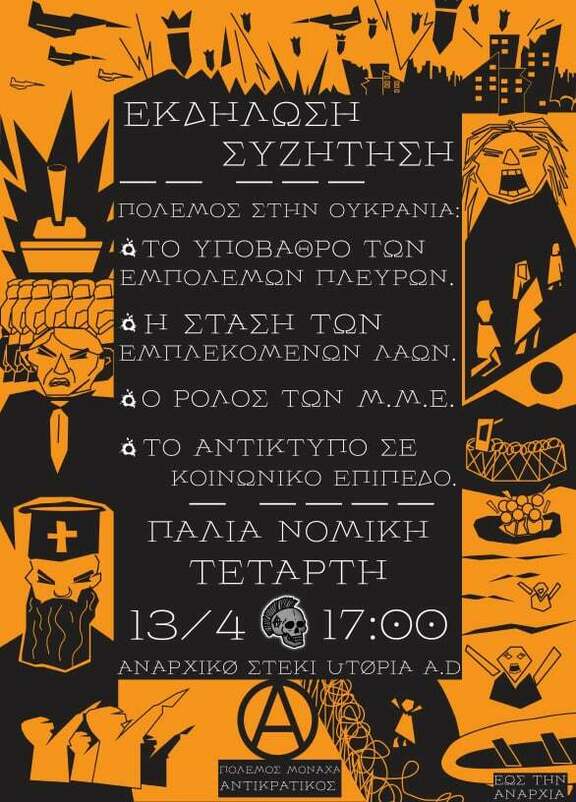 Τη Τετάρτη 13/4 και ώρα 17:00 θα πραγματοποιηθεί Εκδήλωση-Συζήτηση με θέμα "ΠΟΛΕΜΟΣ ΣΤΗΝ ΟΥΚΡΑΝΙΑ". Εισηγήσεις θα γίνουν από το Αναρχικό στέκι Utopia A.D. και από σύντροφο των Ανατρεπτικών Εκδόσεων. Στο χώρο θα υπάρχει έκθεση βιβλίου και κουτί ενίσχυσης πολιτικών κρατουμένων.