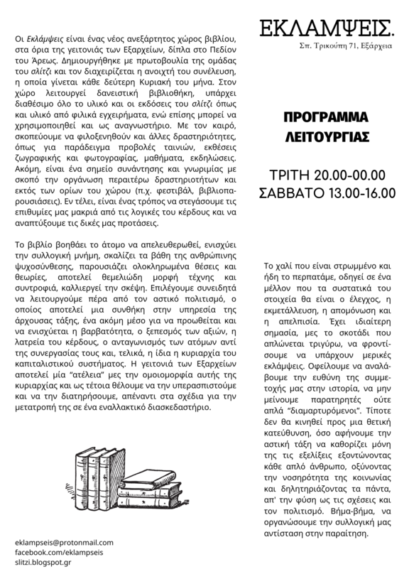 Ανοιχτή, δανειστική βιβλιοθήκη κάθε Τρίτη 20:00-24:00 και κάθε Σάββατο 13:00-16:00.