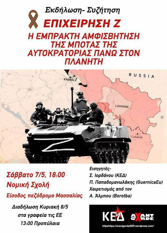 Πιστός υπηρέτης αυτής της πολιτικής και η εξαρτημένη άρχουσα τάξης της Ελλάδας και το Κράτος της, μαζί με σύσσωμη την κυβέρνηση και την αξιωματική αντιπολίτευση υποστηρίζουν το φασιστικό καθεστώς του Κιέβου, την «νόμιμη» άμυνα των νεοναζί, καλωσορίζουν την μαριονέτα των ΗΠΑ-ΕΕ Ζελένσκι,υποθάλπτουν και νομιμοποιούν τον βανδαλισμό του μνημείου του Σοβιετικού Στρατιώτη, φασιστικοποιούν τις νομοθεσίες απέναντι στον εχθρό λαό, για να κάμψουν τις ταξικές-λαϊκές αντιστάσεις απέναντι στην εμπλοκή της χώρας στο πόλεμο και στην γιγάντωση της ακρίβειας και του κόστους ζωής.