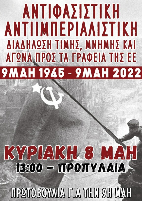 Μέσα σε μια τέτοια συνθήκη, αποτελεί αναγκαιότητα η οργάνωση μιας αντιφασιστικής-αντι ιμπεριαλιστικής διαδήλωσης τιμής, μνήμης και αγώνα για την 9η Μάη που ανήκει οργανικά στο κομμουνιστικό-αντιφασιστικό-αντι