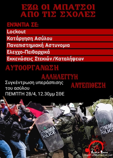 Απέναντι στην κρατική καταστολή και στην προσπάθεια αποστείρωσης των πανεπιστημιακών χώρων οι φοιτητικοί αγώνες θα νικήσουν. Ήδη, σε αυτή την δύσκολη συγκυρία, τα αντανακλαστικά των φοιτητ(ρι)ών ήταν άμεσα και δύο μέρες οι μπάτσοι δεν πέρασαν αλώβητοι από το πανεπιστήμιο. Με όπλο μας την αυτοοργάνωση, με καταλήψεις, πορείες και συγκρούσεις να αποτρέψουμε την είσοδο της πανεπιστημιακής αστυνομίας που ορκίζεται στις 17 Μάη.