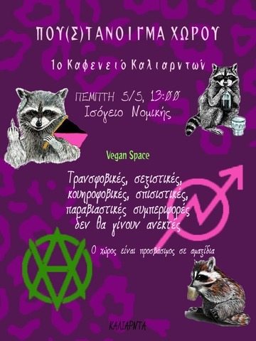 Let's all keep these spaces alive , which apart from fight spaces are our spaces of expression, spaces where we feel like ourselves, where every body feels safe and comfortable and no phobic and authoritarian behavior is tolerated. So, join us in order to listen to music, discuss , read, flirt, chill and enjoy some coffee or tea.