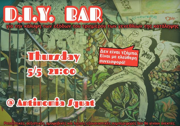Πέμπτη 5/5 στις 21:00, DIY Bar στην Κατάληψη Αντινομία για την κάλυψη των εξόδων του τριημέρου των γενεθλίων της κατάληψης.