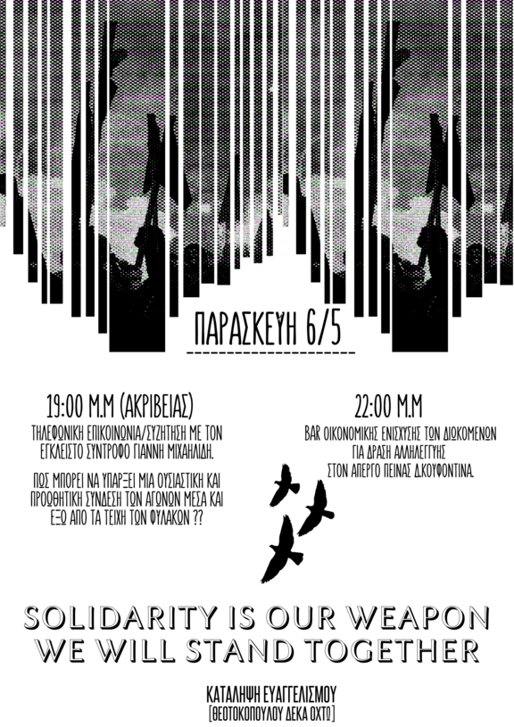 Στις 19:00(αυστηρά) τηλεφωνική επικοινωνία/συζήτηση με τον έγκλειστο σύντροφο Γιάννη Μιχαηλίδη, στον οποίο εκδικητικά αρνούνται την νόμιμη αποφυλάκιση του .