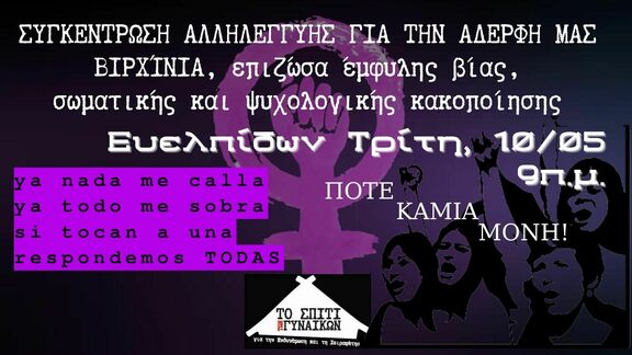 Η Βιρχίνια χρειάζεται τη φυσική μας παρουσία στο δικαστήριο της Τρίτης και δε θα είναι μόνη. Η μάχη της είναι και δική μας μάχη, ενάντια στην ετεροπατριαρχική έμφυλη βία και καταπίεση.
