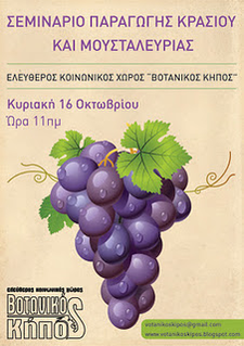 Η Κατάληψη του Βοτανικού Κήπου Πετρούπολης σας καλεί στο σεμινάριο παραγωγής βιολογικού κρασιού και μουσταλευριάς στο πλαίσιο του κύκλου εργαστηρίων αυτομόρφωσης με θέμα «Η Αυτάρκεια ως προϋπόθεση Ελευθερίας».