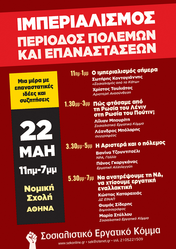 Λιγότερο από δύο εβδομάδες απομένουν ως το μονοήμερο του ΣΕΚ στις 22 Μάη στη Νομική, με θέμα «ιμπεριαλισμός, περίοδος πολέμων και επαναστάσεων-μια μέρα με επαναστατικές ιδέες και συζητήσεις», και ολοένα και περισσότερο κόσμος δηλώνει συμμετοχή από την Αθήνα και άλλες πόλεις αναζητώντας απαντήσεις στις καταιγιστικές εξελίξεις των τελευταίων μηνών.